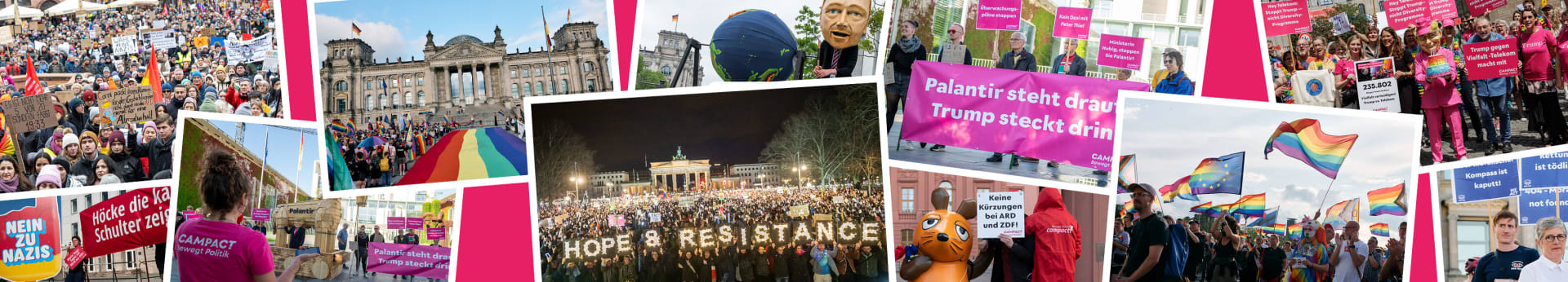 Campact e.V ist eine Kampagnen-Organisation, mit der über 4,25 Millionen Menschen entschlossen für progressive Politik eintreten und unsere Demokratie verteidigen. Wenn wichtige politische Entscheidungen anstehen, starten wir Kampagnen – digital und auf der Straße. Wir schmieden breite Bündnisse und mobilisieren eine starke Bewegung für die gemeinsame Sache. Unsere Kampagnen treiben den ökosozialen Fortschritt voran und verteidigen unsere Demokratie. Damit eine gerechte Gesellschaft entsteht, in der alle Menschen sicher und selbstbestimmt in Frieden und Freiheit leben können.